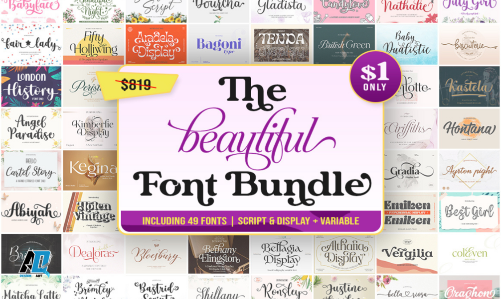 This bundle collects 49 amazing fonts at super cheap prices. This bundle includes various font styles, Script, Serif, Sans Serif, Display, also Variables with hundreds of glyphs, alternatives, ligatures and international language support.